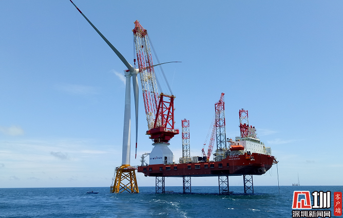 2019年6月27日,中廣核陽(yáng)江南鵬島海上風(fēng)電首臺(tái)風(fēng)機(jī)完成吊裝。