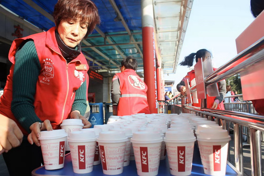 福永義工以及深圳肯德基工作人員現(xiàn)場贈送熱飲。