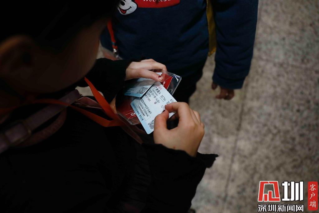 一位乘客正在查看車票,今天前往廣西百色的列車,乘客們需要在廣州南站轉車。