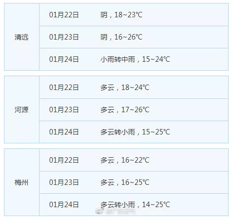 24日(除夕),韶關(guān)北部、清遠(yuǎn)北部有小到中雨,其余市縣多云間陰天,局部有零星小雨,早晨大部分市縣有(輕)霧。
