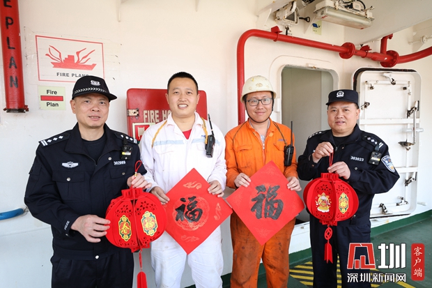 為了讓國際船舶上工作的中國籍船員感受到濃厚的春節(jié)氣息,鹽田邊檢站開展“迎春送?!钡禽喿咴L活動。在實施登輪檢查的同時,向國際船舶上的中國籍船員贈送春聯(lián)、燈籠、中國結(jié)等節(jié)慶用品,將中國的“年”送上國際船舶,向船員送上新春祝福、節(jié)日問候。