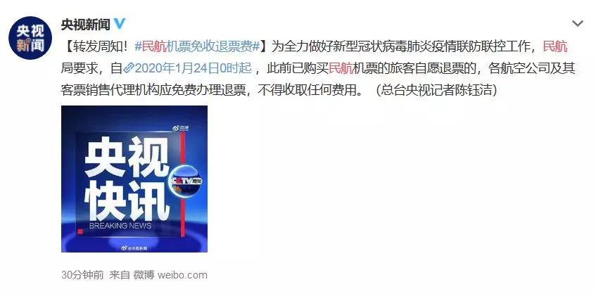 為全力做好新型冠狀病毒肺炎疫情聯(lián)防聯(lián)控工作,民航局要求,自2020年1月24日0時(shí)起,此前已購(gòu)買(mǎi)民航機(jī)票的旅客自愿退票的,各航空公司及其客票銷(xiāo)售代理機(jī)構(gòu)應(yīng)免費(fèi)辦理退票,不得收取任何費(fèi)用。