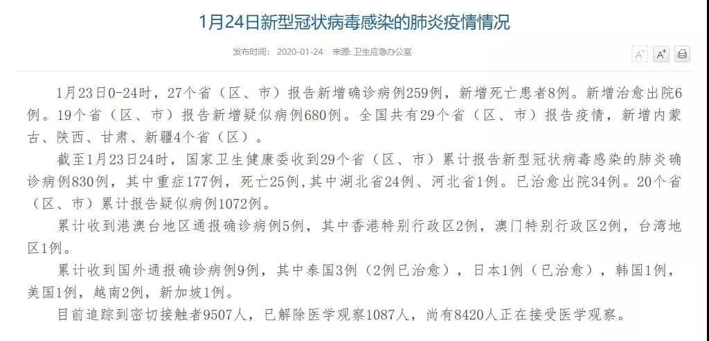 截至1月23日24時(shí),國(guó)家衛(wèi)生健康委收到29個(gè)?。▍^(qū)、市)累計(jì)報(bào)告新型冠狀病毒感染的肺炎確診病例830例,其中重癥177例,死亡25例,其中湖北省24例、河北省1例。已治愈出院34例。20個(gè)?。▍^(qū)、市)累計(jì)報(bào)告疑似病例1072例。