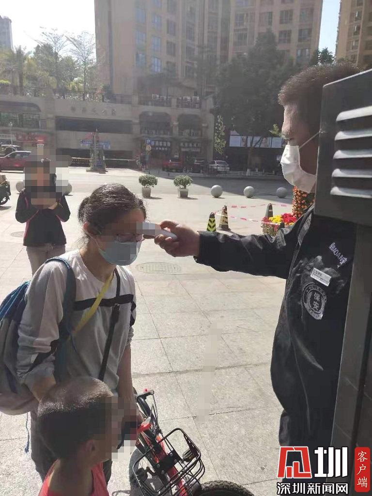 保安對進(jìn)出住戶進(jìn)行體溫測量。