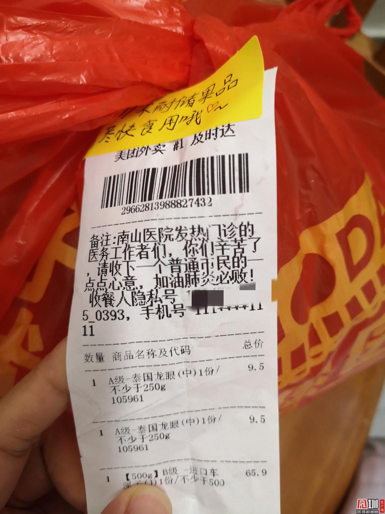 見圳客戶端·深圳新聞網(wǎng)2020年2月1日訊 (見圳客戶端、深圳新聞網(wǎng)記者 劉夢(mèng)婷 通訊員 深協(xié)和)“老淚縱橫!”1月30日晚上8點(diǎn)56分,華中科技大學(xué)協(xié)和深圳醫(yī)院(南山醫(yī)院)手外科護(hù)士王敏在朋友圈曬了一張照片,瞬時(shí)網(wǎng)友們紛紛點(diǎn)贊。照片里是一個(gè)紅色塑料袋上貼著一張外賣單,備注上寫著,“南山醫(yī)院發(fā)熱門診的醫(yī)務(wù)工作者們,你們辛苦了!請(qǐng)收下一個(gè)普通市民的一點(diǎn)點(diǎn)心意,加油,肺炎必?cái)。 ?/p>