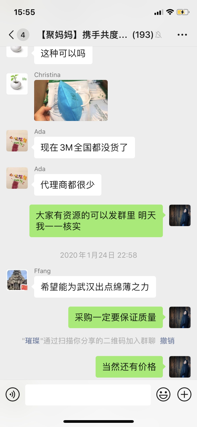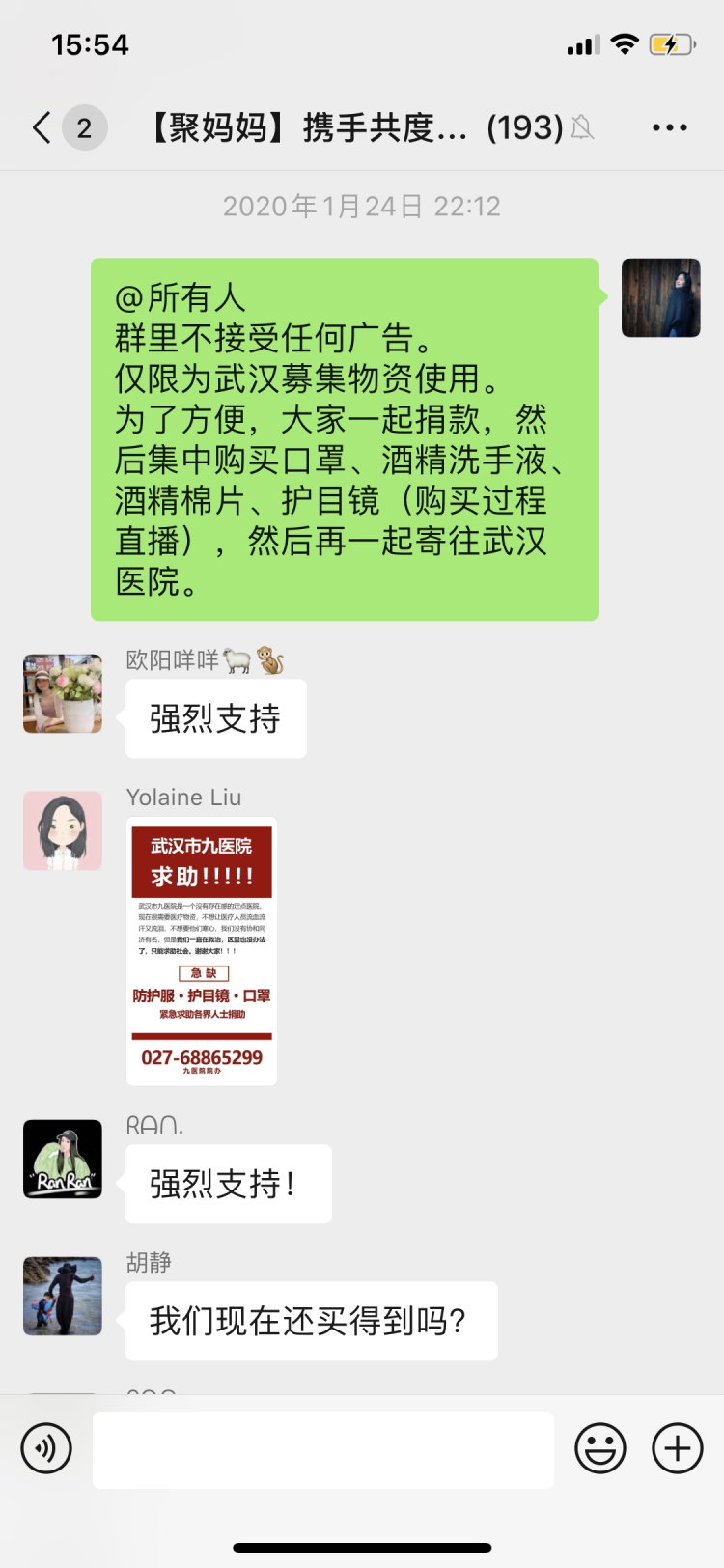 這一百多名媽媽是一個(gè)名為“聚媽媽攜手共渡難關(guān)”(以下簡(jiǎn)稱(chēng)“聚媽媽”)微信群的成員,Miya是“聚媽媽”的發(fā)起人之一。1月24日除夕那天,Miya與一位朋友聊起疫情,兩人都覺(jué)得,醫(yī)院缺物資,一兩人的力量又太單薄,不如發(fā)動(dòng)朋友們一起購(gòu)買(mǎi)直接送到醫(yī)院。Miya在當(dāng)晚9點(diǎn)左右建了這個(gè)臨時(shí)群,并邀請(qǐng)周?chē)熳R(shí)的朋友加入。