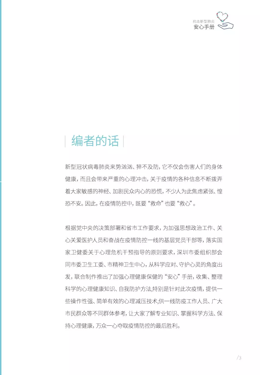 根據(jù)黨中央的決策部署和省市工作要求,為加強思想政治工作、關心關愛醫(yī)護人員和奮戰(zhàn)在疫情防控一線的基層黨員干部等,落實國家衛(wèi)健委關于心理危機干預指導的原則要求,深圳市委組織部會同市委衛(wèi)生工委、市精神衛(wèi)生中心,從科學應對、守護心靈的角度出發(fā),聯(lián)合制作推出了加強心理健康保健的“安心”手冊,收集、整理科學的心理健康知識、自我防護方法,特別是針對此次疫情,提供一些操作性強、簡單有效的心理減壓技術,供一線防疫工作人員、廣大市民群眾等不同群體參考,讓大家了解專業(yè)知識、掌握科學方法、保持心理健康,萬眾一心奪取疫情防控的最后勝利。