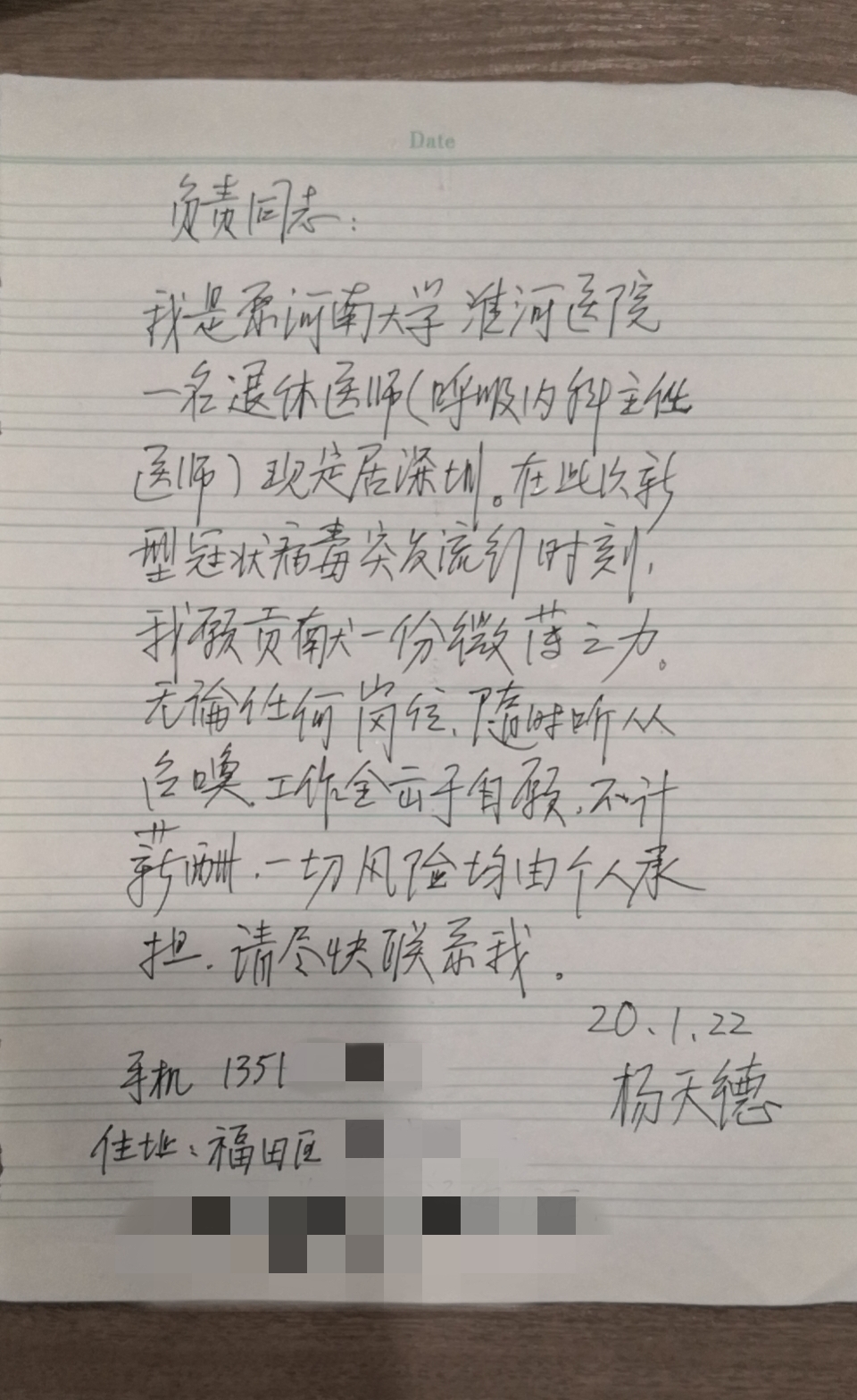 深圳新聞網(wǎng)2月4日訊(見圳客戶端、深圳新聞網(wǎng)記者 邱曉潔)1月23日,福田街道海濱社區(qū)工作站收到一封請愿書,上面寫著:“我愿貢獻(xiàn)一份微薄之力,無論任何崗位,隨時聽從召喚,工作全出于自愿,不計薪酬,一切風(fēng)險均由個人承擔(dān)。”在請愿書的最后,還附上了自己和愛人的聯(lián)系電話及住址。