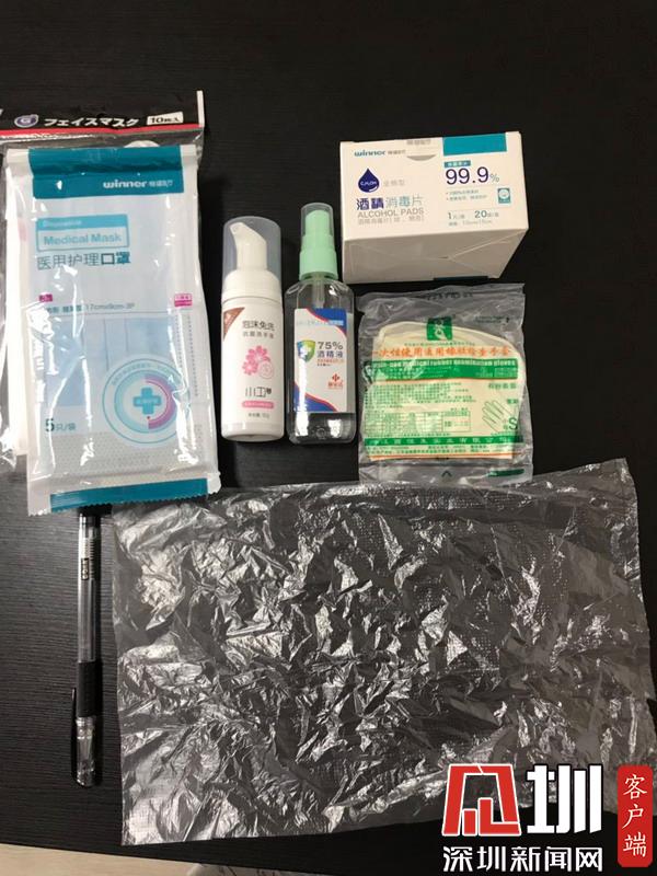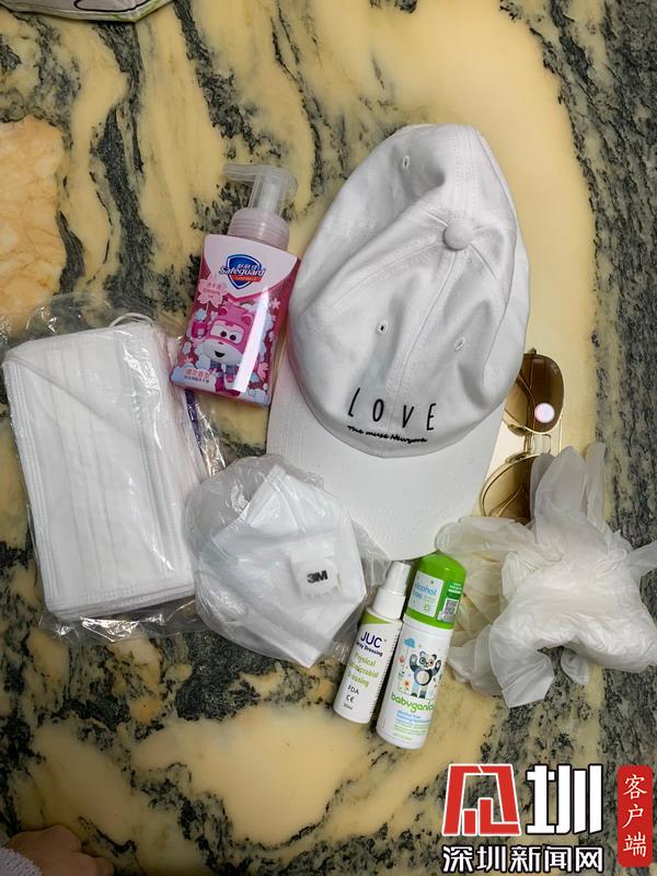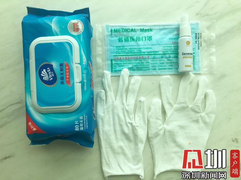 家住福田,在羅湖上班的丘小姐今天也開始了他的復(fù)工第一天,為了在路上做好防護,她準(zhǔn)備了一次性雨衣、鞋套、手套及眼鏡,當(dāng)然口罩必不可少,她還隨身攜帶了含有酒精的免洗洗手液,以備接觸了可疑物品之后能馬上自我消毒。