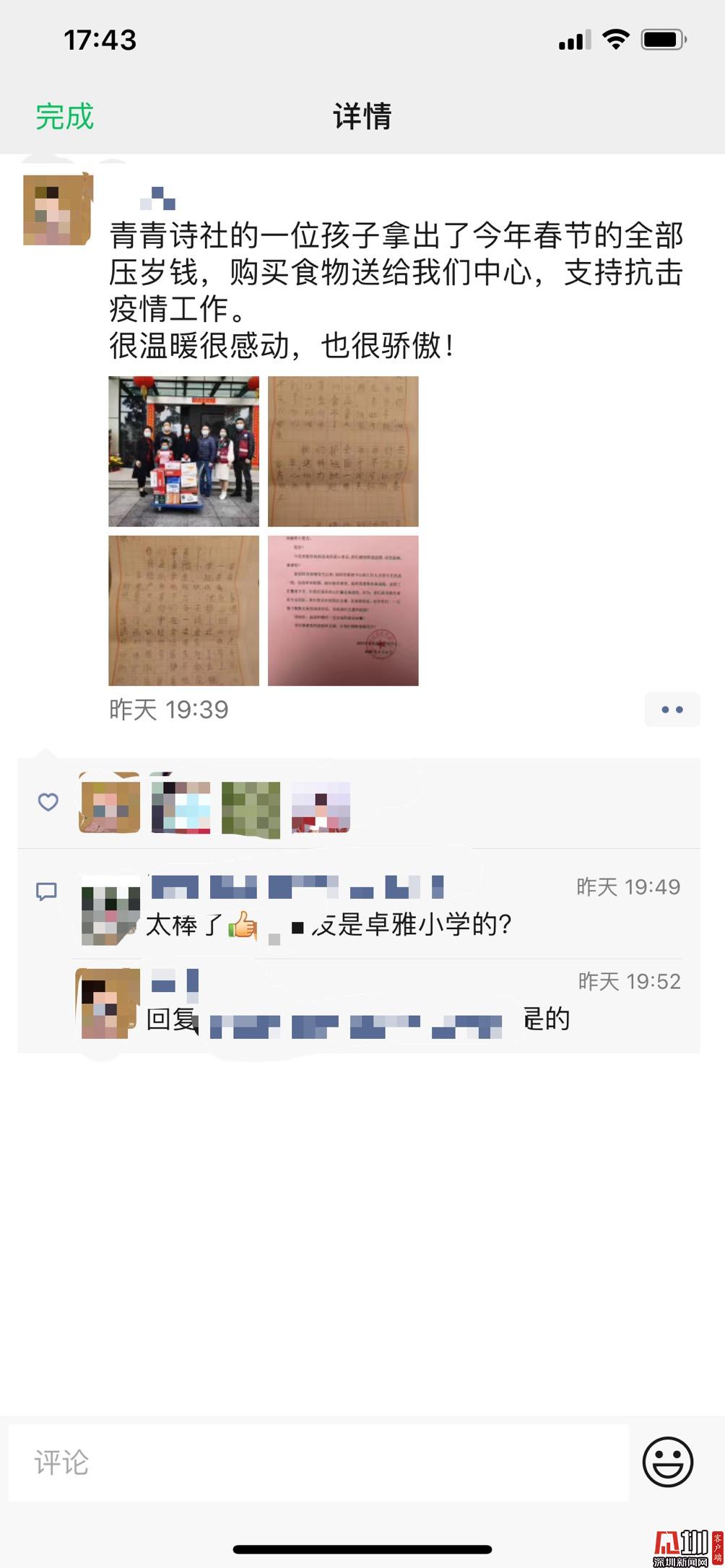 從與家人的密切交談中,他了解到防疫一線工作人員的辛苦,便主動聯(lián)系了在深圳疾控中心工作的桃源青青詩社創(chuàng)始人王老師。因為買不到口罩,在王老師的建議下,張赫奕決定捐贈食品給加班的工作人員補充營養(yǎng)。