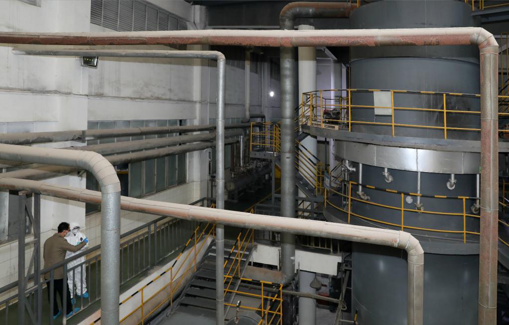 焚燒車間內(nèi),矗立著兩座高達十余米的熱解焚燒爐。焚燒爐中的溫度高達1000°C以上,正在焚燒包括新型冠狀病毒在內(nèi)的多種醫(yī)療廢物。