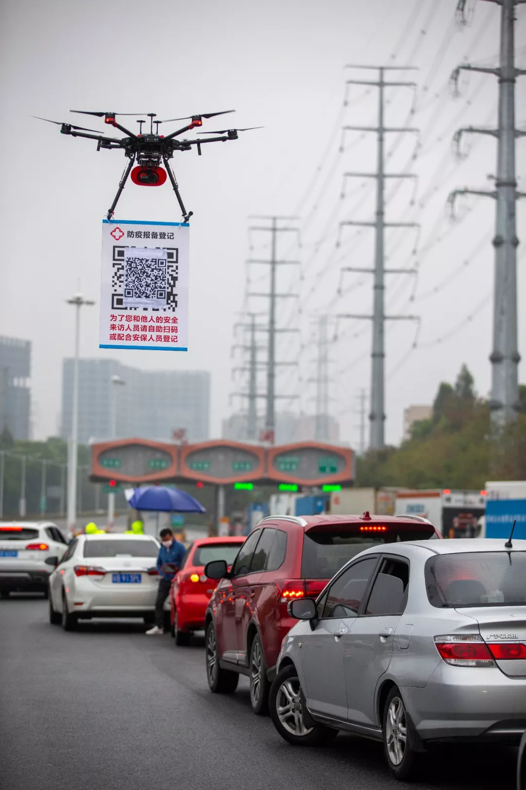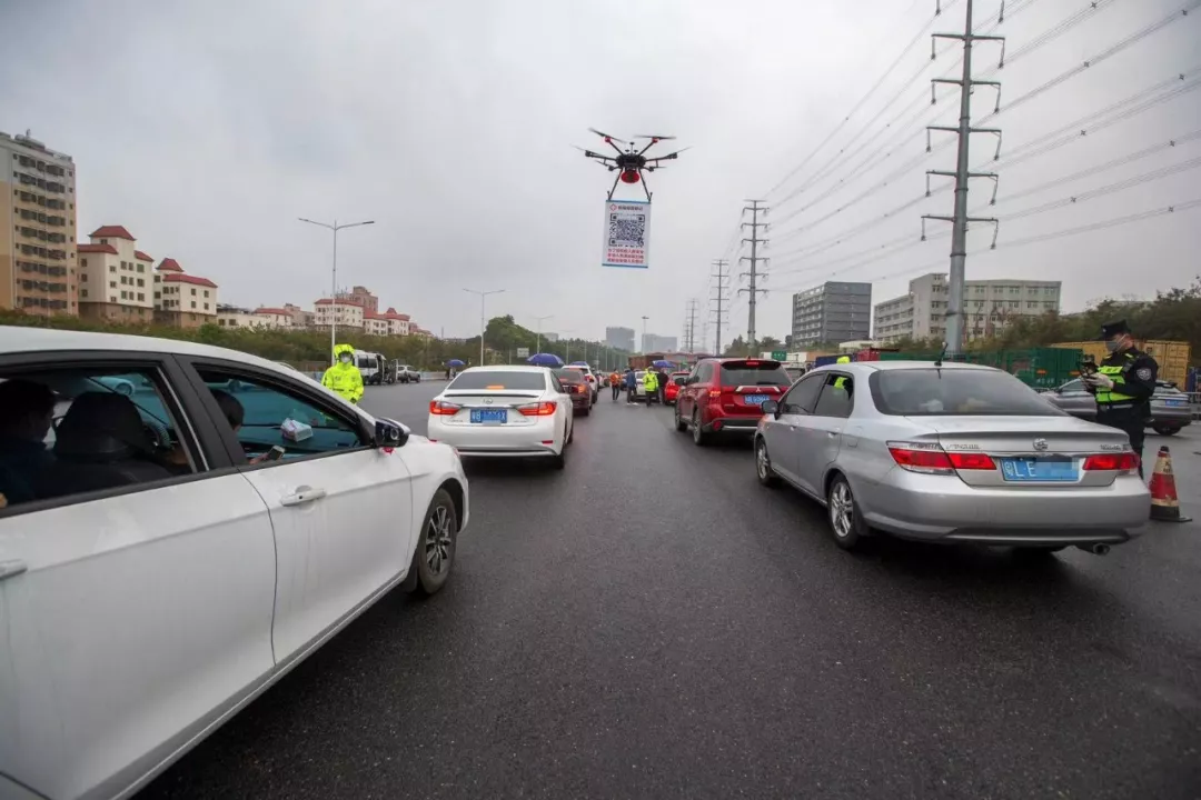 隨著返深車輛和人員的增加,深圳從8日開始啟用線上車輛申報(bào)登記。為提高申報(bào)效率,搭載喊話器、懸掛申報(bào)二維碼的無(wú)人機(jī)成為防疫一線工作人員的得力助手。民警操作無(wú)人機(jī)在車輛隊(duì)伍中穿梭,并通過(guò)喊話器提醒駕乘人員掃碼登記,減少人員接觸的同時(shí)提高了效率。