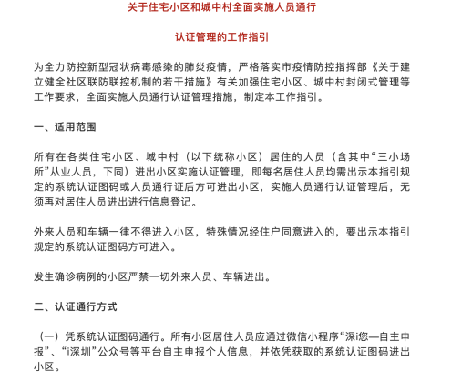 2月9日,深圳發(fā)布《關(guān)于住宅小區(qū)和城中村全面實(shí)施人員通行認(rèn)證管理的工作指引》,文中明確表示所有在各類(lèi)住宅小區(qū)、城中村居住的人員需通過(guò)微信小程序“深i您”、“i深圳”公眾號(hào)等平臺(tái)自主申報(bào)個(gè)人信息,并依憑獲取健康碼進(jìn)出小區(qū),無(wú)須再做登記。