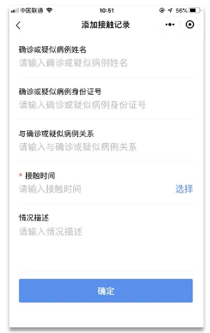 第三步:添加接觸記錄。若與確診或疑似病例有接觸過(guò),需要添加接觸記錄,如有多次接觸記錄,可按實(shí)際填寫多條記錄。
