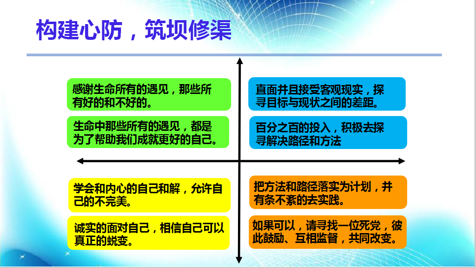 生命中所有的遇見,那些所有好的和不好的,都是為了幫助我們成就更好的自己。我們要學會和內心的自己和解,允許自己的不完美,相信自己可以真正的蛻變。我們更應該感謝生命所有的遇見,直面并且接受客觀現實,探尋目標與現狀之間的差距,進而百分之百的投入,積極去探尋解決路徑和方法,把方法和路徑落實為計劃,并有條不紊的去實踐。如果可以,尋找一位死黨,彼此鼓勵、互相監(jiān)督,共同改變。