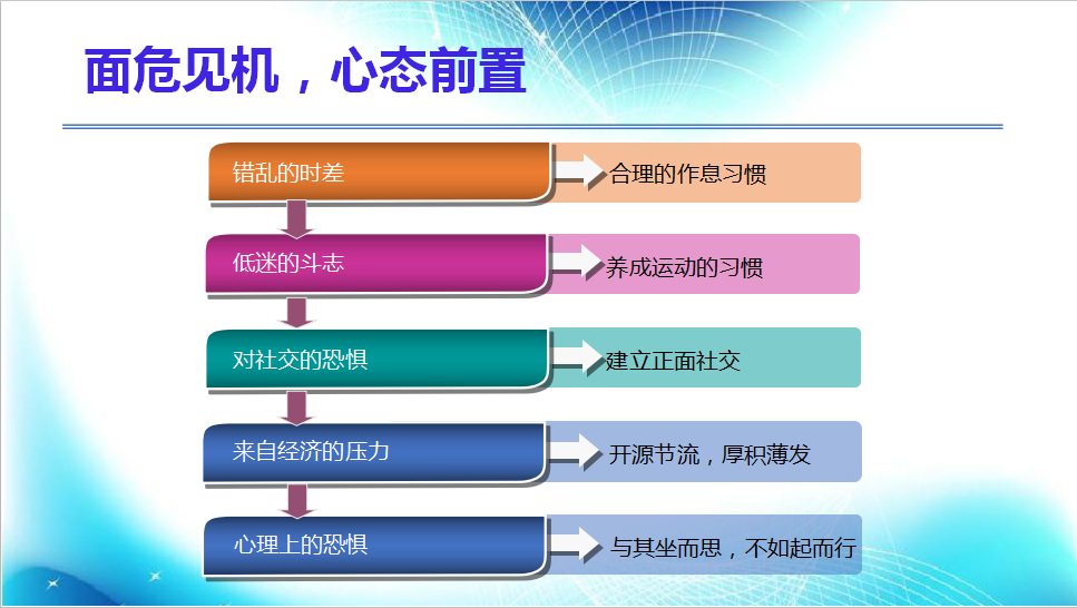 每個人要用一生的時間去修煉一種能力—抗壓能力??箟耗芰褪侨藗兏淖冏约簯峙率?、逃避行動的消極被動的行為習慣,擺脫挫敗、失落、無助的負面消極情緒,能回歸自我、堅定目標、敢于行動的能力。它可以幫助我們在面對焦慮、緊張時,保持絕對的客觀和理性,客觀認識自己當下的問題,并通過積極思考找到應對策略。