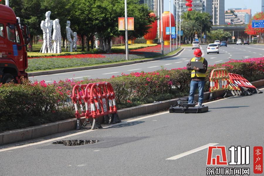 上午10點40分,記者在現(xiàn)場看到,該路面有一個直徑約一米、深約一米的坑口,旁邊還有一道長約20米的裂痕。工作人員正在使用雷達(dá)儀器對地面情況進(jìn)行勘測,同時該路段及靠深南大道一條車道已暫時被封鎖,福田區(qū)交警大隊也在現(xiàn)場指揮交通。據(jù)悉,該位置較臨近的地鐵2、3路線的站點,一位深圳地鐵的工作人員告訴記者,目前該事故沒有對其線路運行造成影響,也非先前修挖地鐵所致。