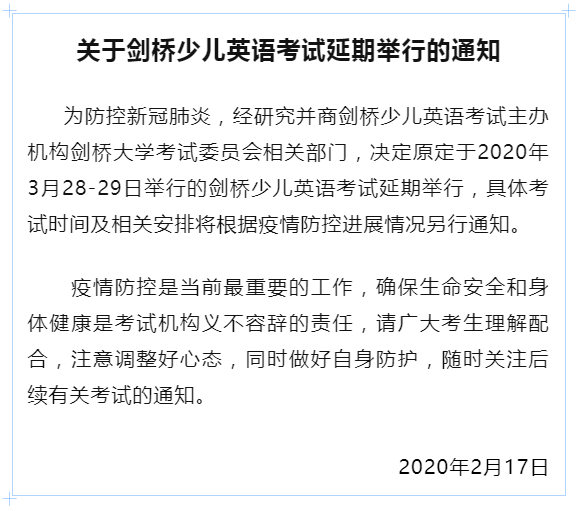 為貫徹落實國家和我省對新型冠狀病毒感染的肺炎疫情防控有關(guān)工作的部署和要求,切實保障廣大考生和考試工作人員生命安全和身體健康,經(jīng)研究決定,推遲原定于3月7-8日舉行的普通高考英語聽說考試和本科插班生考試(含三二分段專升本轉(zhuǎn)段考試)。具體時間安排視疫情控制情況另行通知。
