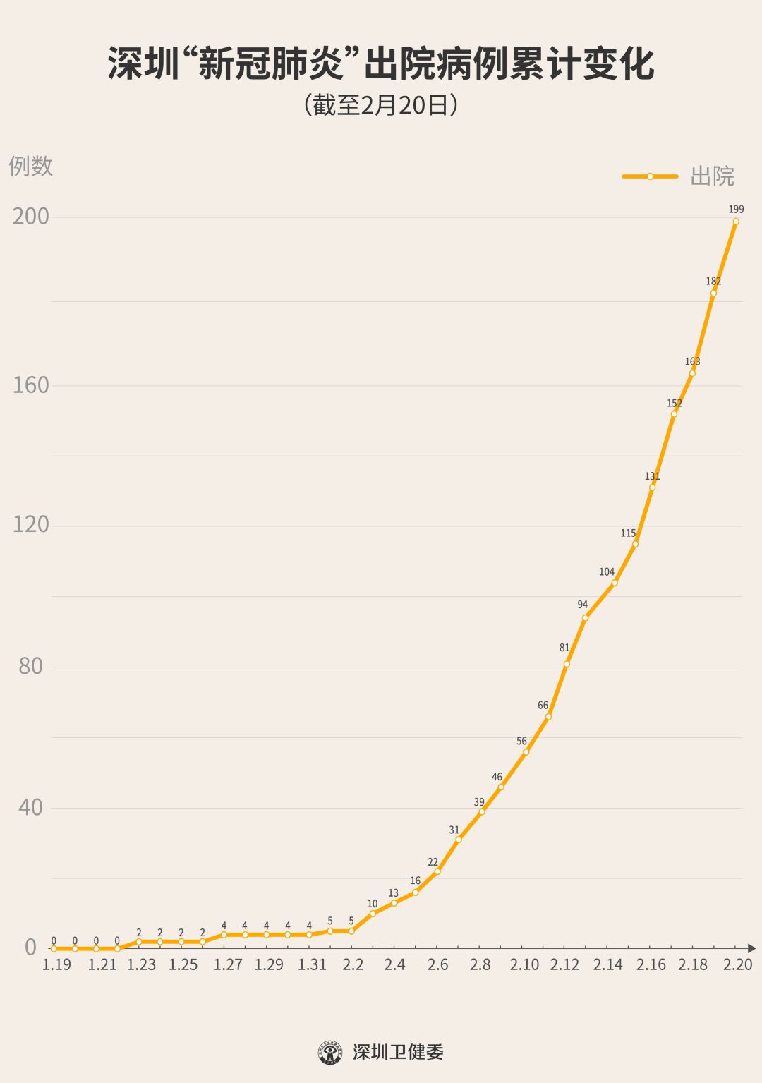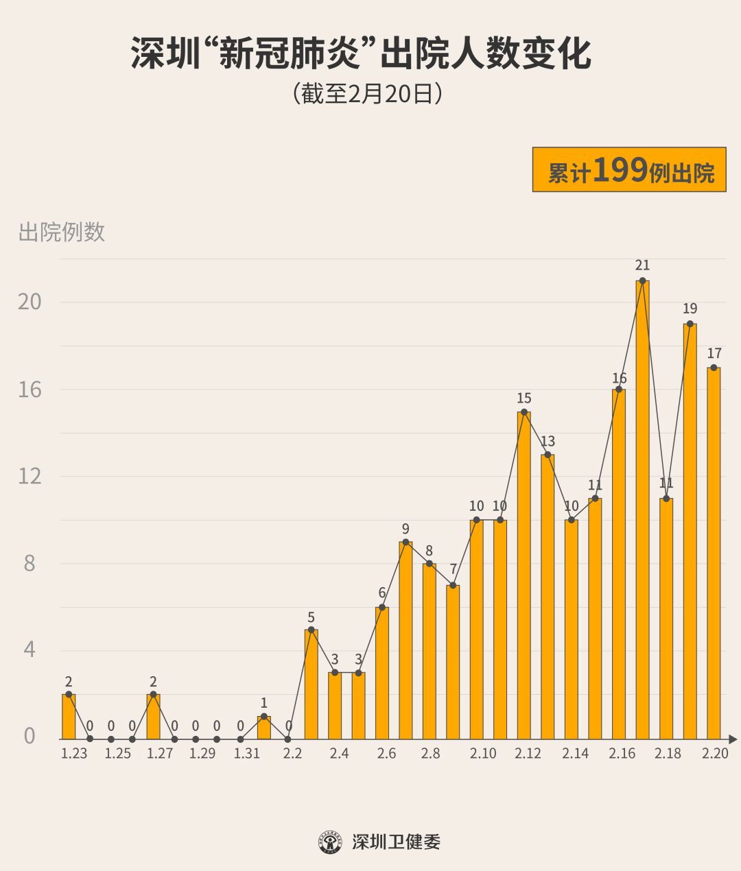 2月20日下午,經(jīng)專家組會診,深圳再有17名新型冠狀病毒肺炎確診患者出院,累計達(dá)199人,連續(xù)18天有人出院。