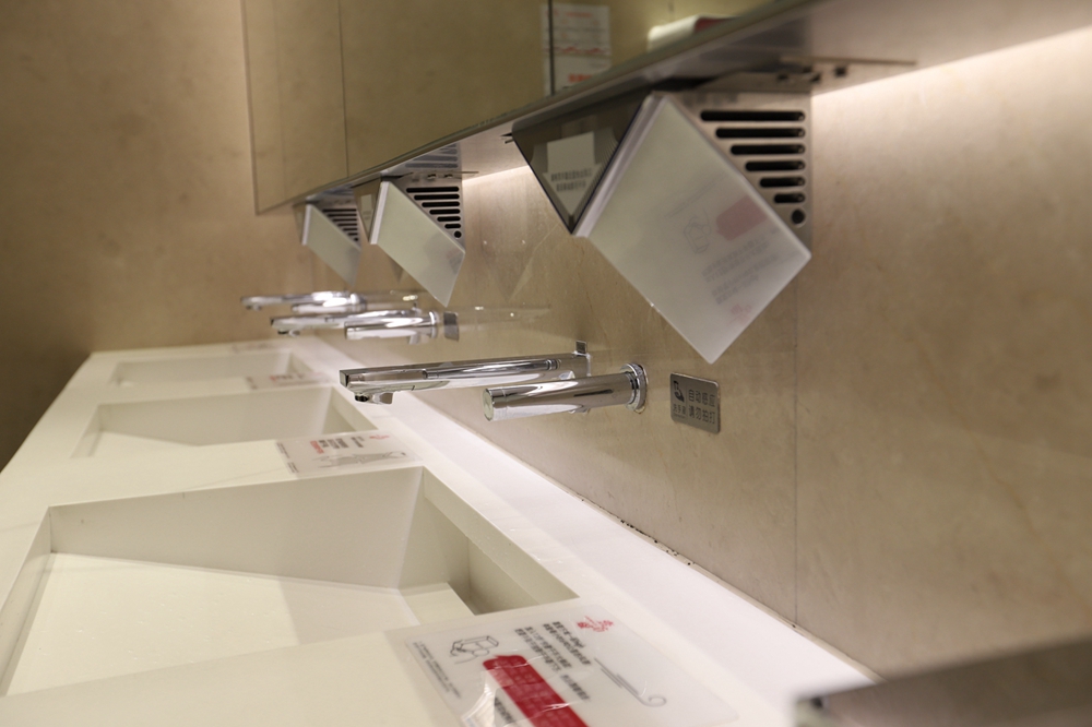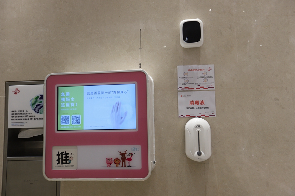 在一樓洗手間記者看到,洗手臺(tái)一側(cè)安置了消毒設(shè)備,并張貼使用提示。據(jù)悉,除了上述防疫物資,壹方城還采購了醫(yī)用手套、防護(hù)服、護(hù)目鏡以及消毒噴霧機(jī)3臺(tái)等,在所有出入口新增自動(dòng)消毒設(shè)備55臺(tái),在洗手間配置消毒設(shè)備186臺(tái)。