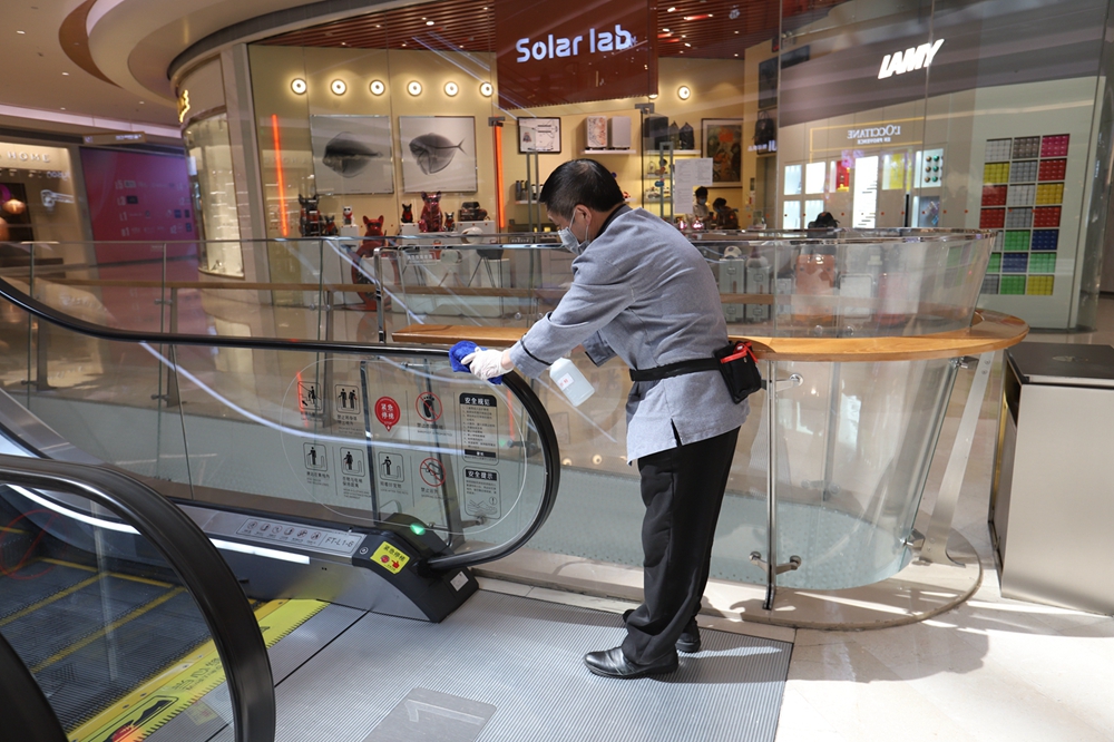 走在商場(chǎng)中,隨時(shí)可以看到保潔人員在消毒清潔。在商場(chǎng)一樓中庭導(dǎo)購屏和導(dǎo)購機(jī)器人處,保潔人員用消毒水反復(fù)擦拭屏幕。據(jù)悉,商場(chǎng)每小時(shí)巡回對(duì)扶梯、電梯、衛(wèi)生間、消防通道、導(dǎo)視屏、扶手欄桿、休閑椅、門把手、垃圾房、垃圾桶等地進(jìn)行消毒。