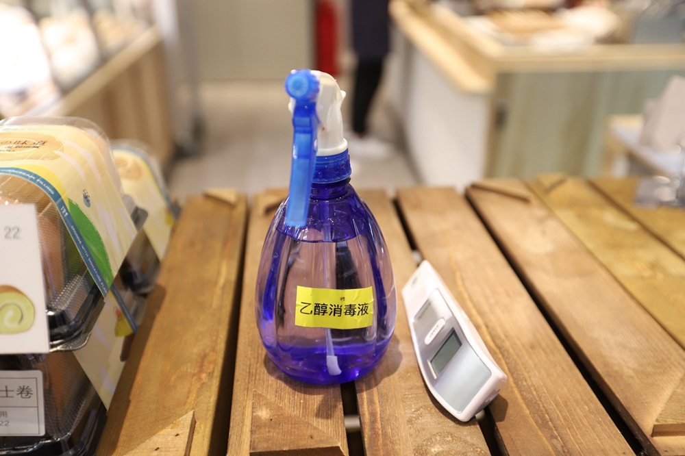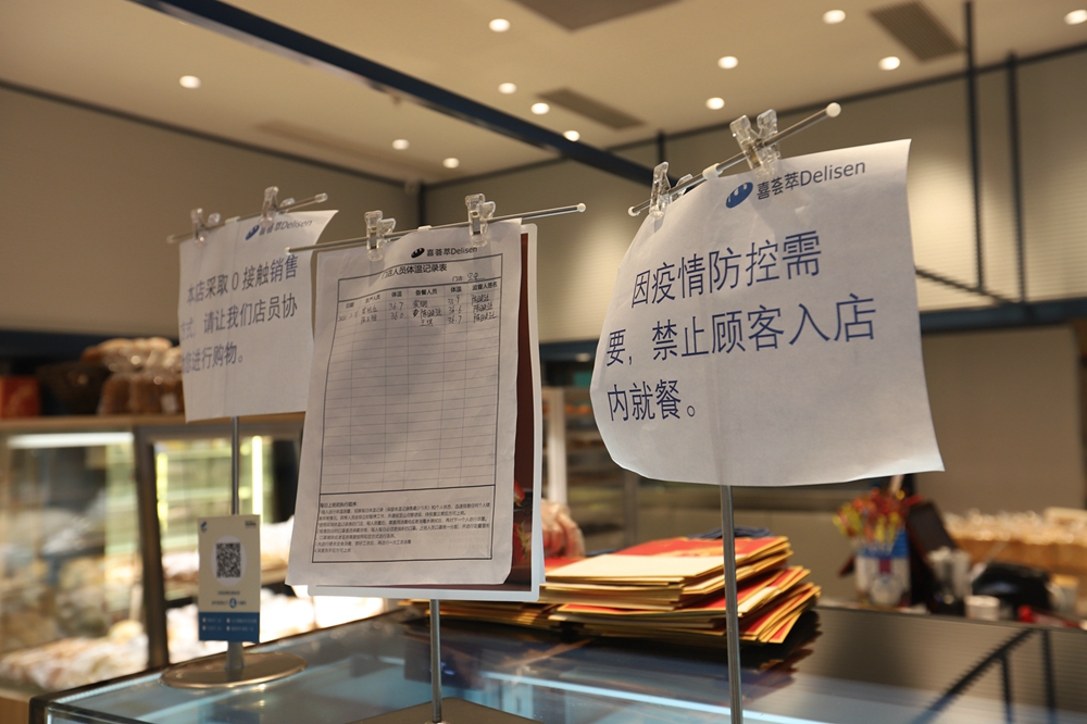 負(fù)二樓的喜薈萃是一家剛開業(yè)沒多久的面包店,記者看到里面燈光明亮、各式面包充盈貨賀,進(jìn)店的通道已全部攔堵,并設(shè)置了取餐及消毒區(qū)。一名市民正在選購面包,他站在店外選好款式后,店員將面包打包好并放在取餐處,市民掃碼付款后就可以帶走了。這就是商場(chǎng)內(nèi)實(shí)行的“零接觸”購物。
