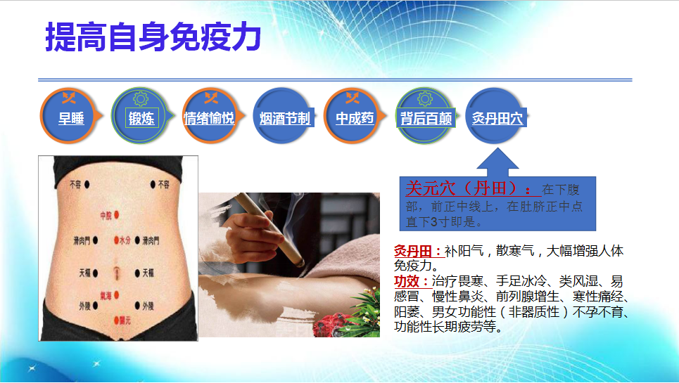 7.灸丹田穴:丹田在下腹部,前正中線上,在肚臍正中點(diǎn)直下3寸即是。灸丹田穴可以補(bǔ)陽(yáng)氣,散寒氣,大幅增強(qiáng)人體免疫力。