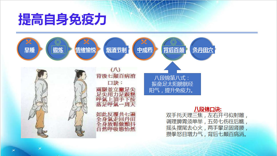 6.背后百顛:背后百顛從養(yǎng)生方法“八段錦”演化而來(lái),口訣如下:雙手托天理三焦,左右開(kāi)弓似射雕,