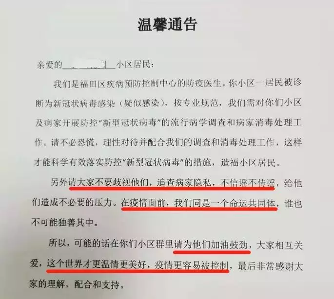 “疫情面前,我們同是一個命運共同體”“大家相互關愛,這個世界才更溫情美好,疫情更容易被控制……”1月30日,位于深圳福田區(qū)的一小區(qū)出現(xiàn)新冠肺炎疑似感染病例,福田區(qū)疾病預防控制中心的防疫醫(yī)生隨即發(fā)布了這則通告,瞬間刷屏了深圳人的朋友圈。通告除了呼吁小區(qū)居民配合調查及消毒處理工作外,還特地懇請大家“不要歧視,在疫情面前,我們是同一個命運共同體,誰也不可能獨善其身。”寥寥數(shù)字的“請求”,感動無數(shù)人。