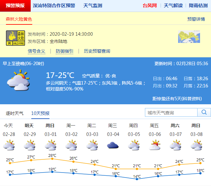 見圳客戶端·深圳新聞網(wǎng)2020年2月28日訊 深圳市氣象臺預計,27日晚到28日,深圳陰天間多云,氣溫18-25 ℃,相對濕度50%-95%,東風3-4級,沿海、高地和海區(qū)陣風可達7級;29日至3月3日多云為主,天氣總體溫暖,氣溫小幅波動,早晚有輕霧,偶有零星小雨;4日 -5日受冷空氣影響,氣溫明顯下降,其中4日有零星小雨。