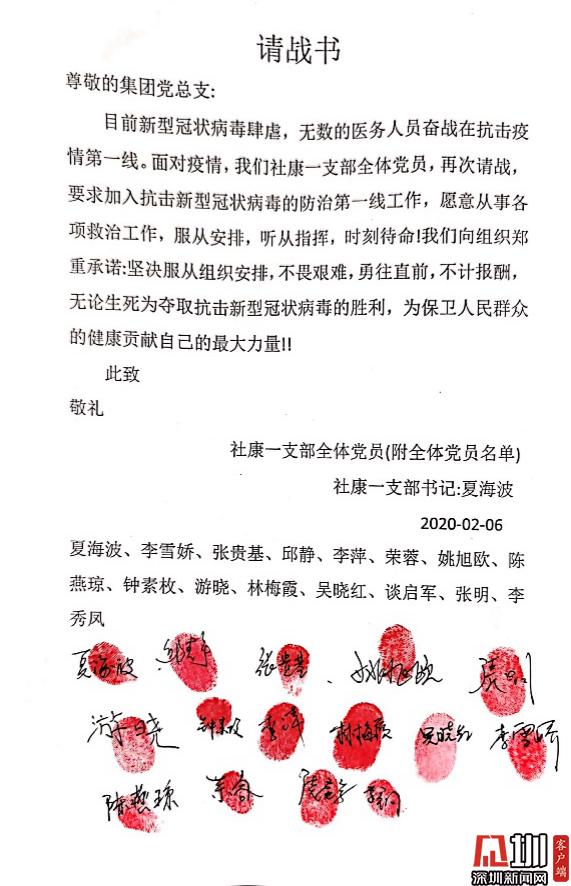 見圳客戶端·深圳新聞網(wǎng)訊(記者 董非)“讓黨旗在防控斗爭第一線高高飄揚(yáng)。”新冠肺炎疫情發(fā)生以來,南山區(qū)醫(yī)療集團(tuán)總部黨員勇當(dāng)先鋒,以實(shí)際行動(dòng)踐行初心使命,涌現(xiàn)出眾多感人故事,展現(xiàn)了共產(chǎn)黨員的風(fēng)采與擔(dān)當(dāng)。 疫情發(fā)生后,南山區(qū)第一時(shí)間制定出臺了《黨建引領(lǐng)疫情防控工作五項(xiàng)行動(dòng)方案》,南山區(qū)委書記王強(qiáng)號召全體黨員,發(fā)揮黨組織的戰(zhàn)斗堡壘作用和黨員的先鋒模范作用,全力保障人民群眾生命安全和身體健康,讓黨旗在防控疫情斗爭第一線高高飄揚(yáng),堅(jiān)決打贏疫情防控人民戰(zhàn)爭、總體戰(zhàn)、阻擊戰(zhàn)。南山區(qū)醫(yī)療集團(tuán)總部積極響應(yīng),黨建引領(lǐng)下的防控抗疫工作有序科學(xué)地展開。 今年1月底,深圳市南山區(qū)區(qū)委授旗成立南山醫(yī)療系統(tǒng)黨員突擊隊(duì)。南山區(qū)醫(yī)療集團(tuán)總部緊急組建了防控新冠肺炎應(yīng)急突擊隊(duì),僅一天內(nèi)區(qū)醫(yī)療集團(tuán)就共有169人完成第一批應(yīng)急突擊隊(duì)報(bào)名,其中黨員過半數(shù)。 疾風(fēng)知?jiǎng)挪荩一馃捳娼?。一封封請?zhàn)書閃電匯聚到黨總支,召即來,來能戰(zhàn),戰(zhàn)能勝,沖鋒在前就是擔(dān)當(dāng)?shù)淖蠲姥堇[;一位位黨員迅速入隊(duì)黨員突擊隊(duì),他們重溫入黨誓言,在黨旗下實(shí)踐著醫(yī)者仁心、人間大愛;一份份入黨申請書紛沓而來,特殊時(shí)期經(jīng)受特殊考驗(yàn),一批優(yōu)秀的醫(yī)護(hù)人員頁主動(dòng)向黨組織靠攏。鏗鏘的語言、堅(jiān)定的決心、舍我的擔(dān)當(dāng),是南山區(qū)醫(yī)療集團(tuán)總部廣大黨員逆行而上、抗擊疫情的堅(jiān)定決心和必勝信心。 最美逆行黨支部,積極請戰(zhàn)敢擔(dān)當(dāng) “我是共產(chǎn)黨員,我請戰(zhàn)!愿為戰(zhàn)勝疫情全力以赴!”這是南山區(qū)醫(yī)療集團(tuán)總部一支部13名黨員和2名入黨積極分子聯(lián)名撰寫的《請戰(zhàn)書》(節(jié)選)。 面對新冠肺炎疫情,一支部黨員在夏海波支部書記夏海波的帶領(lǐng)下,在發(fā)熱門診、發(fā)熱患者預(yù)檢分診、社區(qū)“三位一體”排查等工作中,積極發(fā)揮共產(chǎn)黨員戰(zhàn)斗在一線、沖鋒在一線的模范帶頭作用,為戰(zhàn)勝新冠肺炎疫情全體黨員積極主動(dòng)請戰(zhàn),并向集團(tuán)黨總支遞交了請戰(zhàn)書。 社康一支部全體黨員的請戰(zhàn)書 一個(gè)個(gè)紅手印,令人淚目,彰顯著南山區(qū)醫(yī)療集團(tuán)總部白衣天使們逆行而上的使命擔(dān)當(dāng)和責(zé)任意識。 一支部書記夏海波說,“成為疫情防控工作第一線發(fā)展黨員,是面對疫情充分發(fā)揮黨員先鋒作用的具體實(shí)踐。此次請戰(zhàn),將更加激勵(lì)他們我們在今后的工作特別是近期防疫防控工作中,以黨員的標(biāo)準(zhǔn)嚴(yán)格要求自己,發(fā)揮黨員先鋒模范作用。同時(shí),也會對全院全體員工產(chǎn)生積極引領(lǐng)、鼓舞作用,以更飽滿的斗志投入防疫防控工作?!?/p> 老黨員重溫入黨誓詞,面對黨旗表決心 “我宣誓:我志愿加入中國共產(chǎn)黨……”這是一次特別的宣誓。接到組織號召后,社康二支部的老黨員鐘達(dá)宏和吳麗娉,對著黨旗,以重溫入黨誓詞的方式,不忘黨員初心,牢記使命,積極沖鋒在前,誓要打贏防控狙擊戰(zhàn)。 社康二支部的老黨員鐘達(dá)宏和吳麗娉,對著黨旗,重溫入黨誓詞,誓要打贏防控狙擊戰(zhàn) 面對來勢洶洶的疫情,南山區(qū)醫(yī)療集團(tuán)總部的黨組織和黨員干部不但沒有被嚇倒,反而激起了他們昂揚(yáng)的戰(zhàn)斗意志和飽滿的工作熱情。 “我宣誓,我自愿加入抗擊新型冠狀病毒肺炎疫情防控工作隊(duì)伍,責(zé)任上肩,聽黨指揮,服從命令,科學(xué)應(yīng)對,恪盡職守,努力守護(hù)轄區(qū)居民健康,堅(jiān)決打贏疫情防控攻堅(jiān)戰(zhàn)!”守土有責(zé)、守土擔(dān)責(zé)、守土盡責(zé),所有社康中心的黨員干部將筑牢抗疫的基層防線,誓要守護(hù)轄區(qū)居民的生命健康。 社康二支部黨員在黨旗下宣誓努力守護(hù)轄區(qū)居民健康 艱難時(shí)刻主動(dòng)請戰(zhàn),夫妻雙雙奮戰(zhàn)一線 1月26日,南山區(qū)醫(yī)療集團(tuán)總部下發(fā)關(guān)于組建防控新型冠狀病毒感染肺炎應(yīng)急突擊隊(duì)報(bào)名的通知。除了得到集團(tuán)黨員們的積極響應(yīng)之外,各個(gè)支部涌現(xiàn)出一波遞交入黨申請書的小高潮。 李婧是社康支部的一名全科醫(yī)生,一直在社康醫(yī)院中心從事全科醫(yī)療工作,戰(zhàn)“疫”的號角吹響,李婧第一時(shí)間參戰(zhàn),在所有抗疫時(shí)期入黨人員里第一個(gè)遞交了手寫入黨申請書。 李婧醫(yī)生的手寫入黨申請書 起初,她所在的蔚藍(lán)海岸社康中心考慮到李婧的愛人是深圳市公立醫(yī)院急診科醫(yī)生其愛人是深圳市某公立醫(yī)院的急診科醫(yī)生,疫情發(fā)生以來一直堅(jiān)守在崗位上,家中尚有1歲零3個(gè)月的寶寶,就沒有讓她參加社區(qū)“三位一體”排查和酒店留守值班等一線工作和醫(yī)學(xué)觀察點(diǎn)留守值班等一線工作。李婧得知后,她主動(dòng)提交請戰(zhàn)書、舍小家顧大家,并沒有因?yàn)樯钌系睦щy而