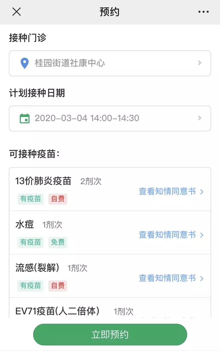 2.成功關(guān)聯(lián)寶寶后,點(diǎn)擊立即預(yù)約,選擇接種機(jī)構(gòu)及計(jì)劃接種日期,查看可接種疫苗的針次及疫苗庫(kù)存,確認(rèn)無(wú)誤后立即預(yù)約。