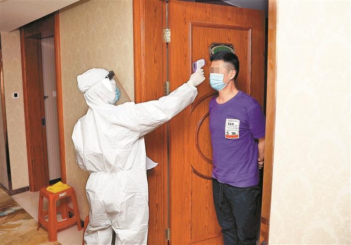 ▲醫(yī)務(wù)人員為醫(yī)學(xué)觀察人員測量體溫。深圳晚報記者楊少昆攝