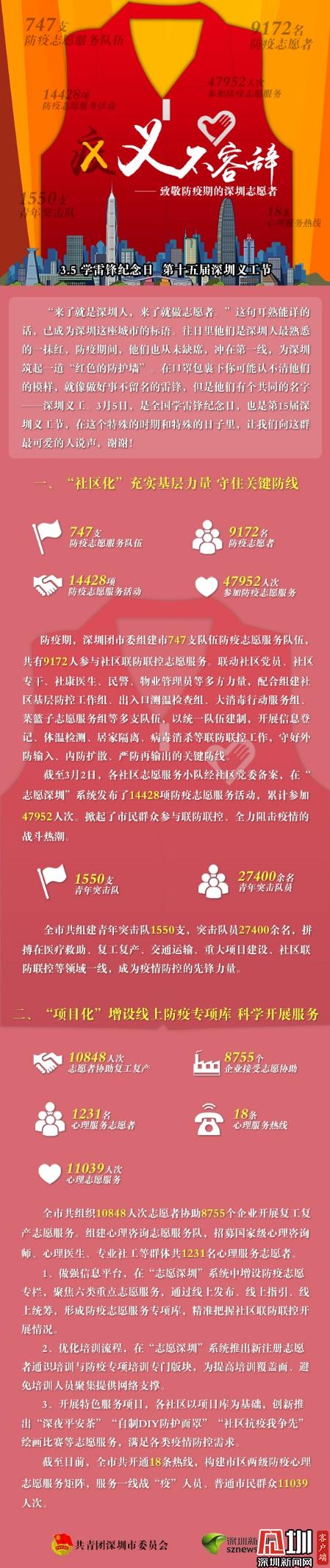 據(jù)了解,防疫期間,深圳團市委組建747支防疫志愿服務隊伍,共9172人參與社區(qū)聯(lián)防聯(lián)控志愿服。截至3月2日,各社區(qū)志愿服務小隊經(jīng)社區(qū)黨委備案,在“志愿深圳”系統(tǒng)發(fā)布了14428項防疫志愿服務活動,累計參加47952人次。在深圳戰(zhàn)“疫”的關(guān)鍵時刻,全市共組建青年突擊隊1550支,突擊隊員27400余人,拼搏在醫(yī)療救助、復工復產(chǎn)、交通運輸、重大項目建設(shè)、社區(qū)聯(lián)防聯(lián)控等領(lǐng)域一線,成為疫情防控的先鋒力量。