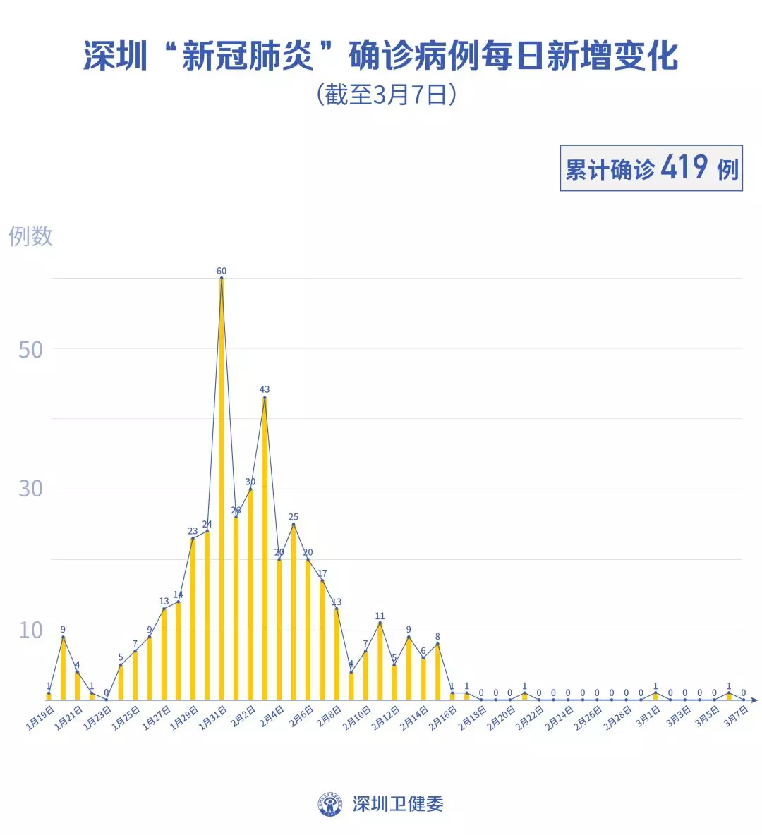 截至3月7日24時(shí),深圳累計(jì)報(bào)告“新冠肺炎”確診病例419例。3月7日當(dāng)天全市無(wú)新增確診病例,當(dāng)天出院病例7例(從2月26日起不再公布出院個(gè)案)。