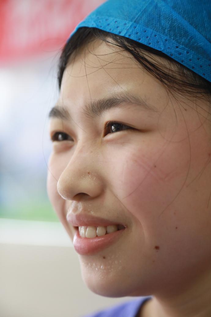 黃青青性格開朗,適應能力強,她平時不愛吃的胡蘿卜、包菜等食物,但到了一線再也不挑食了。身材瘦弱的她在忙碌十多天后有些消瘦,但她總是打趣道:“別看我瘦,力量可大著呢!”協(xié)助病人翻身,耐心為病人喂飯,只要病人需要的,她都會盡自己的全力做好,病區(qū)的病人也為她豎起大拇指。