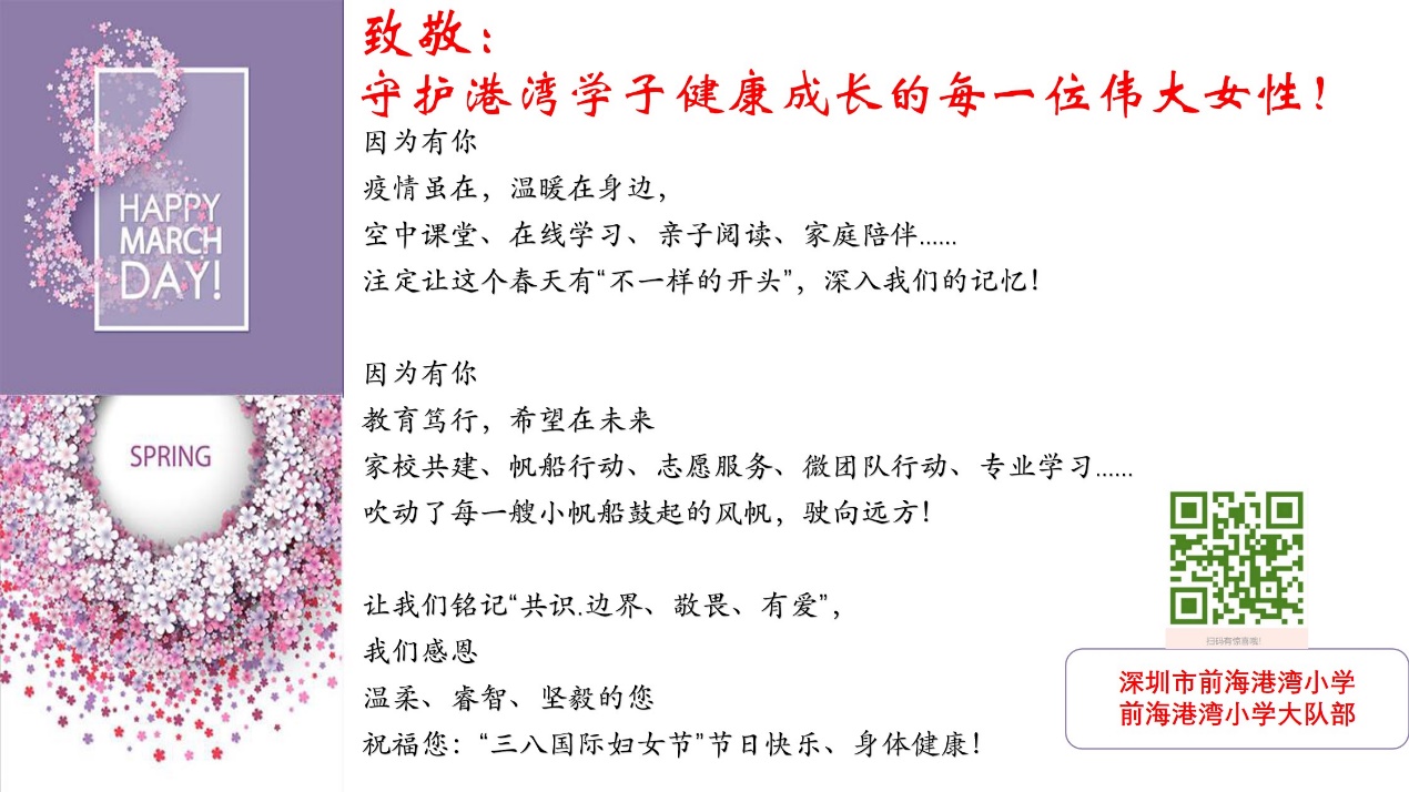 3月8日,“國際婦女節(jié)”,在這個特殊的節(jié)日里,前海港灣小學又是怎樣給“女神們”過節(jié),學校又送了哪些溫馨的祝福,一起來看一看:
