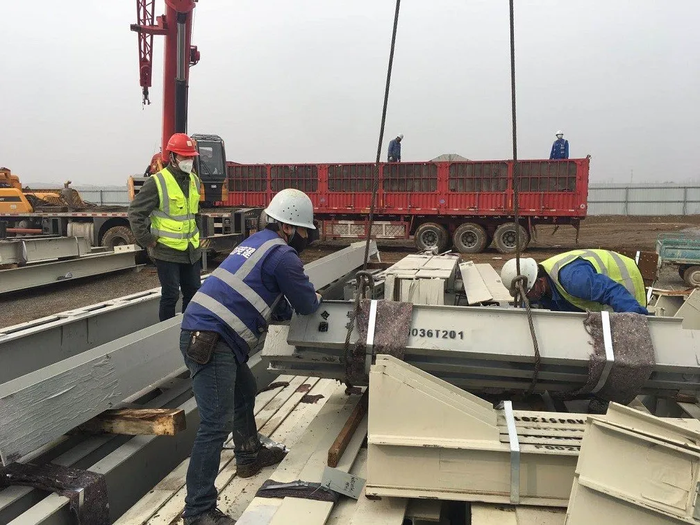 任丘能源生態(tài)園復工后首車鋼結(jié)構到現(xiàn)場,相關人員正在有序清點、卸車、堆放,為下一步安裝工程夯實基礎。