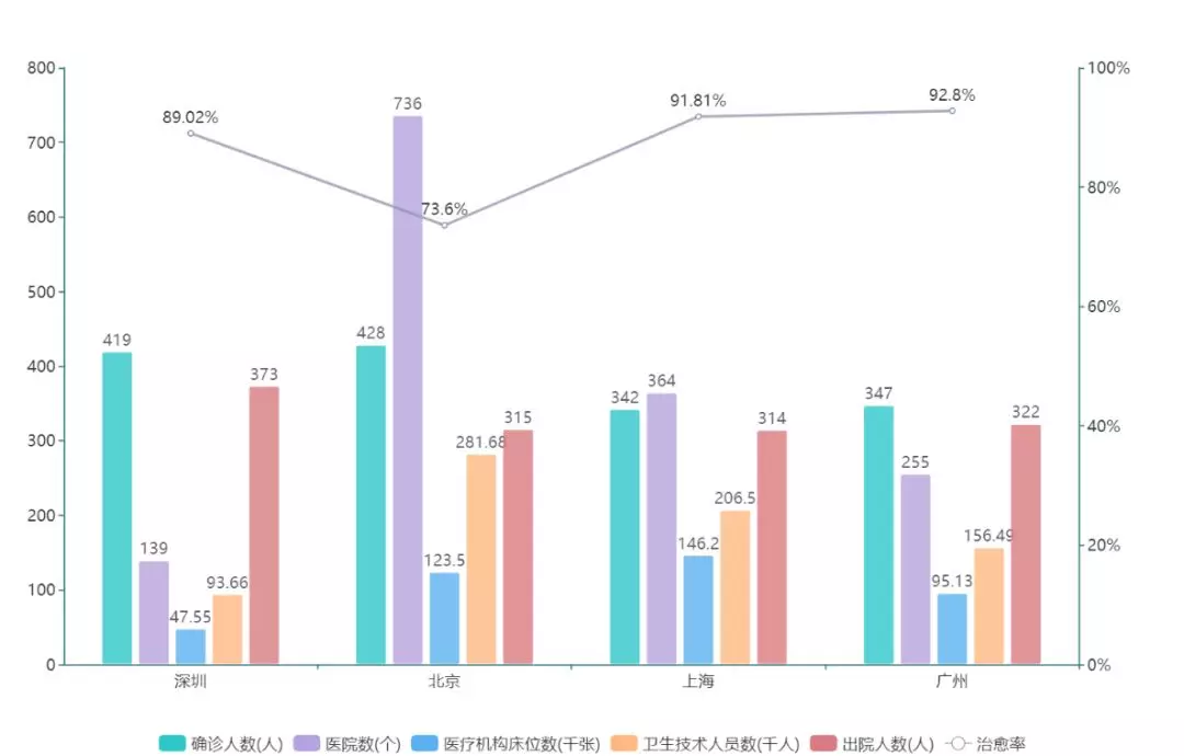 ▲對比北京、上海、廣州等城市,深圳的醫(yī)院數(shù)、床位數(shù)及衛(wèi)生技術(shù)人員數(shù)量都處在第四位,醫(yī)療資源現(xiàn)有儲備略顯不足,勢必給疫情防控過程中的患者救治工作帶來嚴(yán)峻考驗。