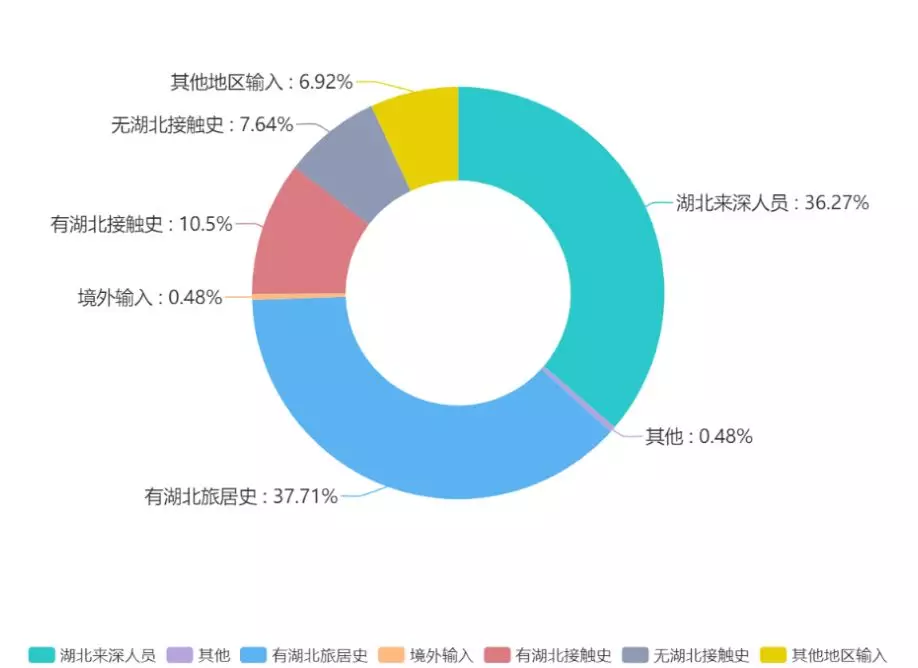 ▲所有輸入型病例中,近六成與湖北武漢有關(guān)聯(lián),湖北省其他城市也為重點來源地區(qū)??梢?,對湖北來深人員、有湖北旅居史人員的管控工作是防疫工作的重要一環(huán)。