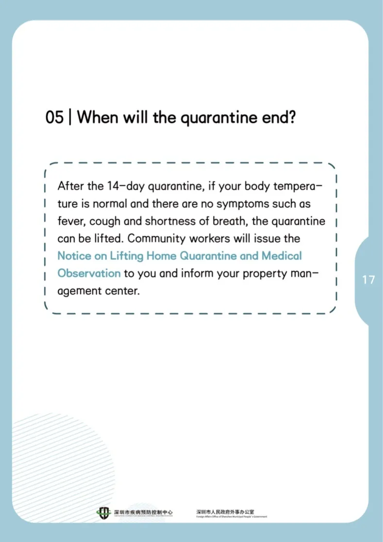 隔離滿14天后,如果體溫正常,無發(fā)熱、咳嗽、氣促這些癥狀,就可以解除隔離了。社區(qū)工作人員會(huì)發(fā)放《解除居家隔離醫(yī)學(xué)觀察告知書》,并通知物業(yè)。