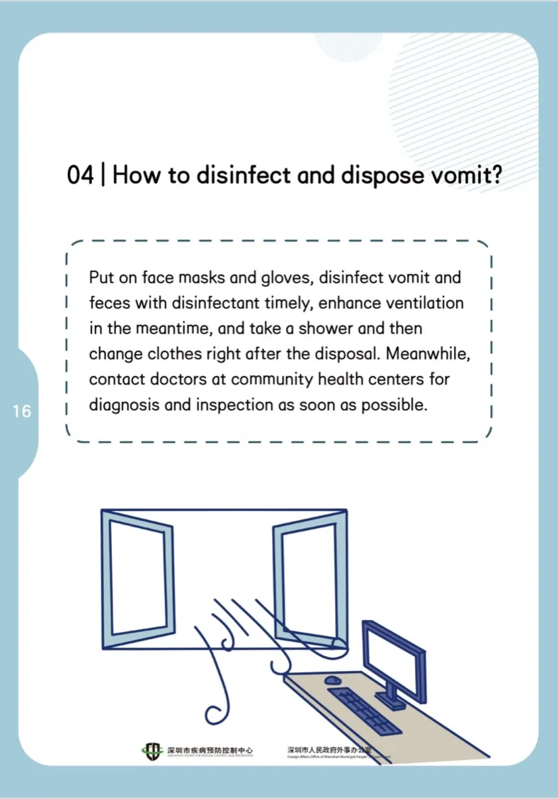 戴上口罩及手套,及時(shí)用消毒液對嘔吐物、排泄物進(jìn)行消毒,同時(shí)加強(qiáng)通風(fēng),處理完后及時(shí)洗浴更換衣物。同時(shí)盡快聯(lián)系社康醫(yī)生進(jìn)行診查。