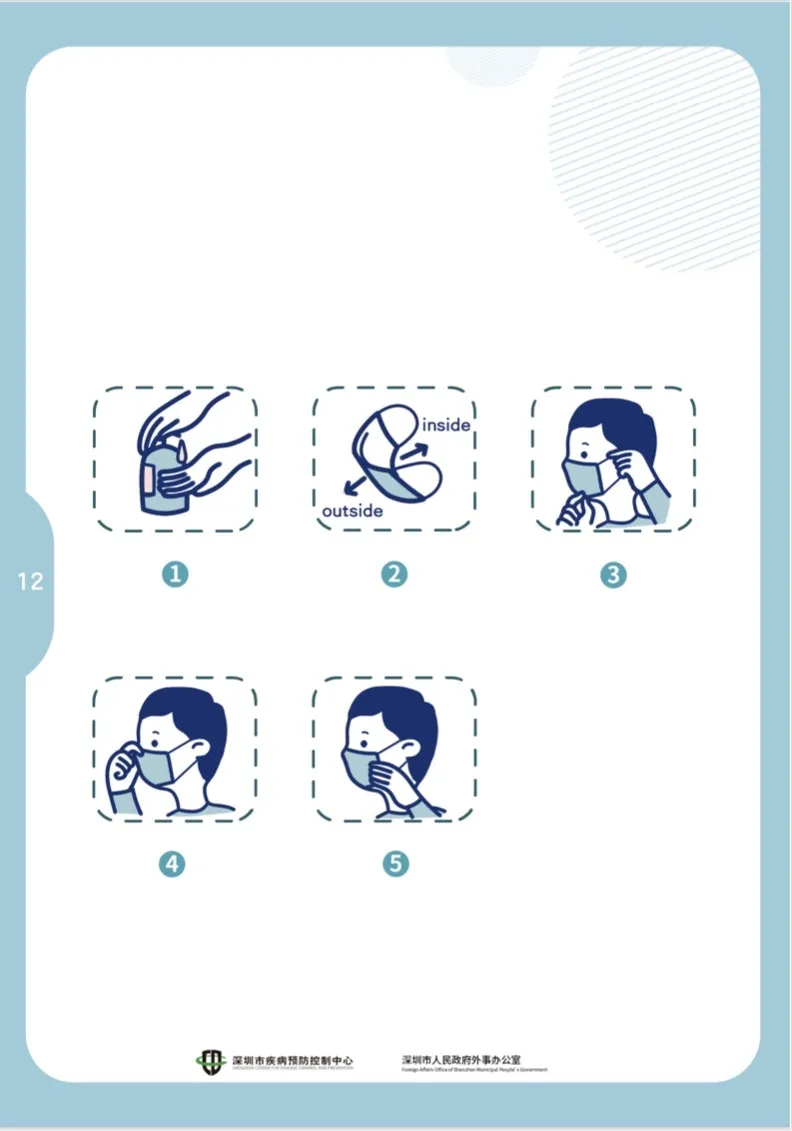 首先洗手——確認(rèn)內(nèi)外:有鼻夾的一端朝上,淺色一面朝自己——將掛繩繞在耳朵上,拉開口罩,把鼻、口、下巴罩好——把鼻夾沿鼻梁處貼緊——適當(dāng)調(diào)整口罩,使口罩周邊充分貼合面部。
