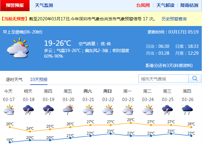 深圳17日回暖增濕,18-19日有雷陣雨。17日可見陽光,早晚有輕霧,19-26℃;18-19日多云到陰天,有雷陣雨局部大雨;20-23日溫暖濕潤(rùn),早晚有輕霧或霧。