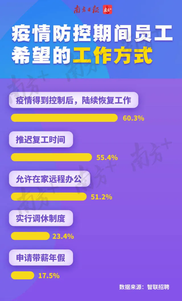 其中,60.3%的職場人希望疫情得到控制后再陸續(xù)復(fù)工,盡管這種理想狀況可能性不大,也有55.4%的職場人希望推遲復(fù)工時間,51.2%的職場人呼吁遠(yuǎn)程辦公。