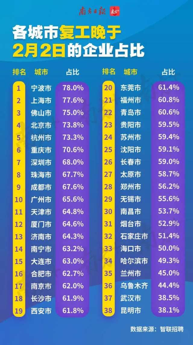 同樣根據(jù)這份《報告》,全國各城市晚于2月2日復(fù)工的企業(yè)占比統(tǒng)計排名顯示,前10名中9個城市均為南方城市,寧波企業(yè)延遲復(fù)工響應(yīng)度最高,確定2月2日后復(fù)工的企業(yè)占比達(dá)到了78%。前10名中4個為廣東城市,分別是佛山、深圳、珠海、廣州。