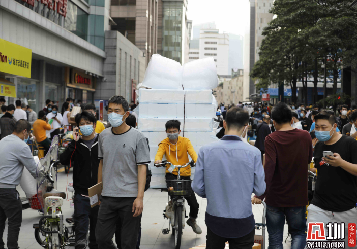 華強(qiáng)北商圈,一位正在運(yùn)送貨物的人。