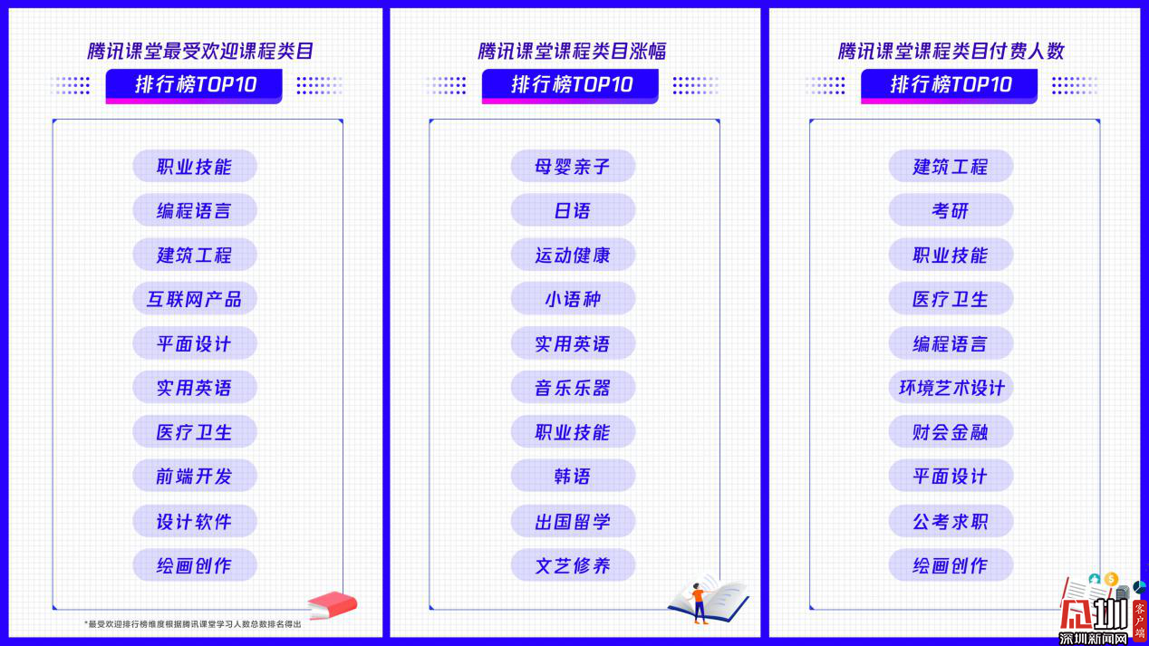 見圳客戶端·深圳新聞網(wǎng)2020年3月18日訊(見圳客戶端、深圳新聞網(wǎng)記者 劉夢婷)近日,在線職業(yè)教育平臺騰訊課堂發(fā)布數(shù)據(jù)報告:戰(zhàn)“疫”宅家期間,該平臺上課總時長提升3.5倍。同時,騰訊課堂還發(fā)布了最受歡迎課程類目(學習人數(shù))排行榜TOP10:職業(yè)技能、編程語言、建筑工程、互聯(lián)網(wǎng)產(chǎn)品、平面設(shè)計、實用英語、醫(yī)療衛(wèi)生、前端開發(fā)、設(shè)計軟件、繪畫創(chuàng)作。此外母嬰親子、日語、運動健康等課程學習人數(shù)同比漲幅均超過400%,成騰訊課堂增速最快類目,或成為未來在線職業(yè)教育新的增長點。IT互聯(lián)網(wǎng)就業(yè)類課程、工業(yè)產(chǎn)品設(shè)計類課程付費能力強,付費人數(shù)同比漲幅超過50%。