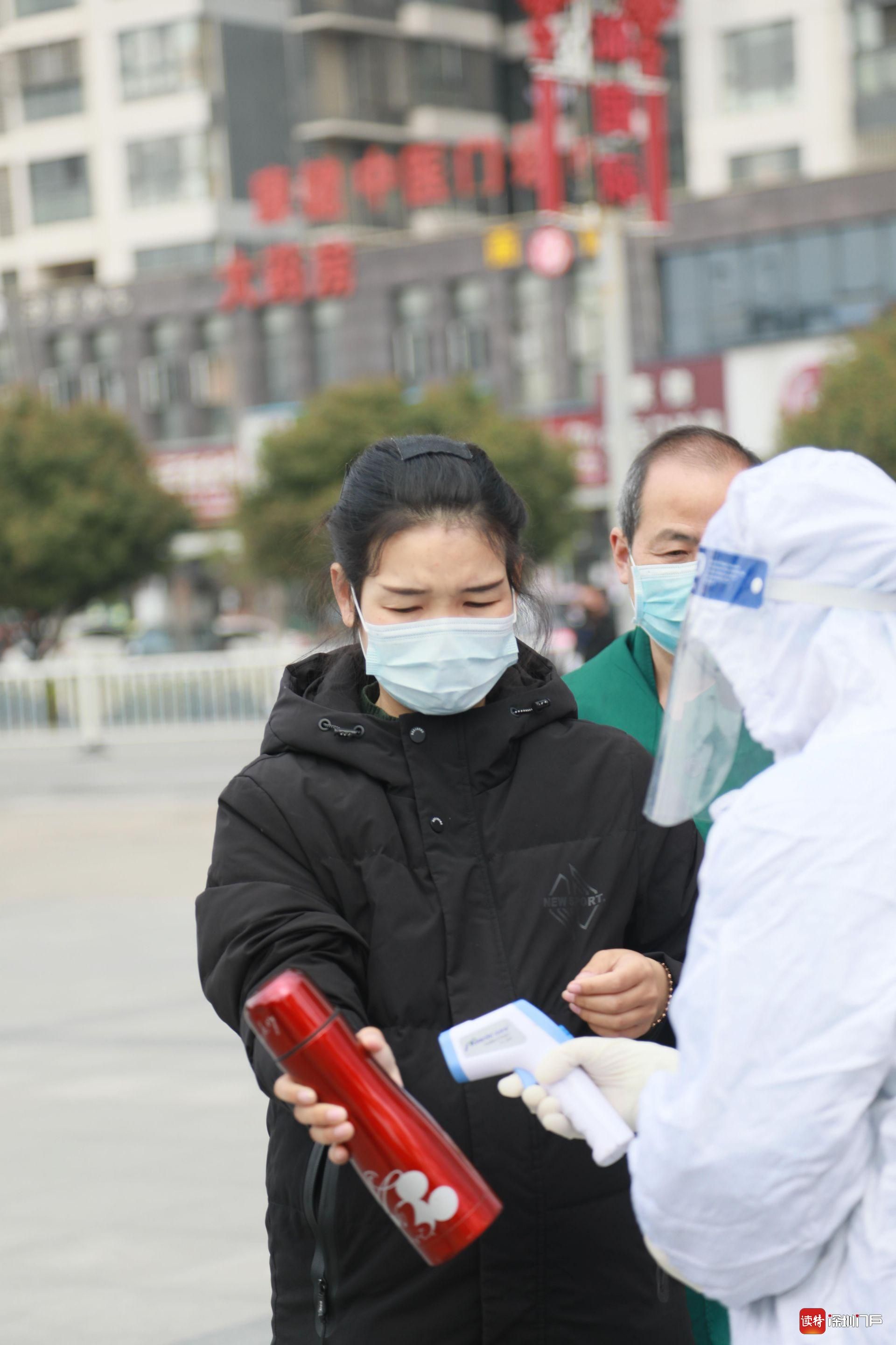 2月16日,監(jiān)利縣人民醫(yī)院,接受體溫檢測的當(dāng)?shù)厝罕姟?/p>