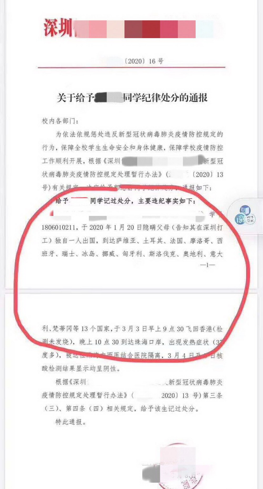 3月3日,小Y從珠海入境回國(guó),在過海關(guān)時(shí)出現(xiàn)發(fā)燒癥狀并送往珠海中西醫(yī)結(jié)合醫(yī)院進(jìn)行隔離檢測(cè)。“在過關(guān)的時(shí)候需要填寫旅行史,我如實(shí)填寫了,因?yàn)樵?jīng)到過意大利等國(guó)家所以海關(guān)會(huì)重點(diǎn)監(jiān)測(cè)我。因?yàn)樽陨砻庖吡Φ?,以及倒時(shí)差的原因,有些感冒低燒,但我也沒有隱瞞什么,如實(shí)闡述了我的行程和身體狀況,也很配合海關(guān)人員的調(diào)查。”3月4日、5日,當(dāng)事人核酸檢測(cè)結(jié)果均為陰性,由于違反定瞞報(bào)行程,小Y被學(xué)校予以記過處分。對(duì)于學(xué)校的處分決定,她坦言接受?!拔覜]有如實(shí)向?qū)W校匯報(bào)我的行程,我接受學(xué)校對(duì)我的處分。”